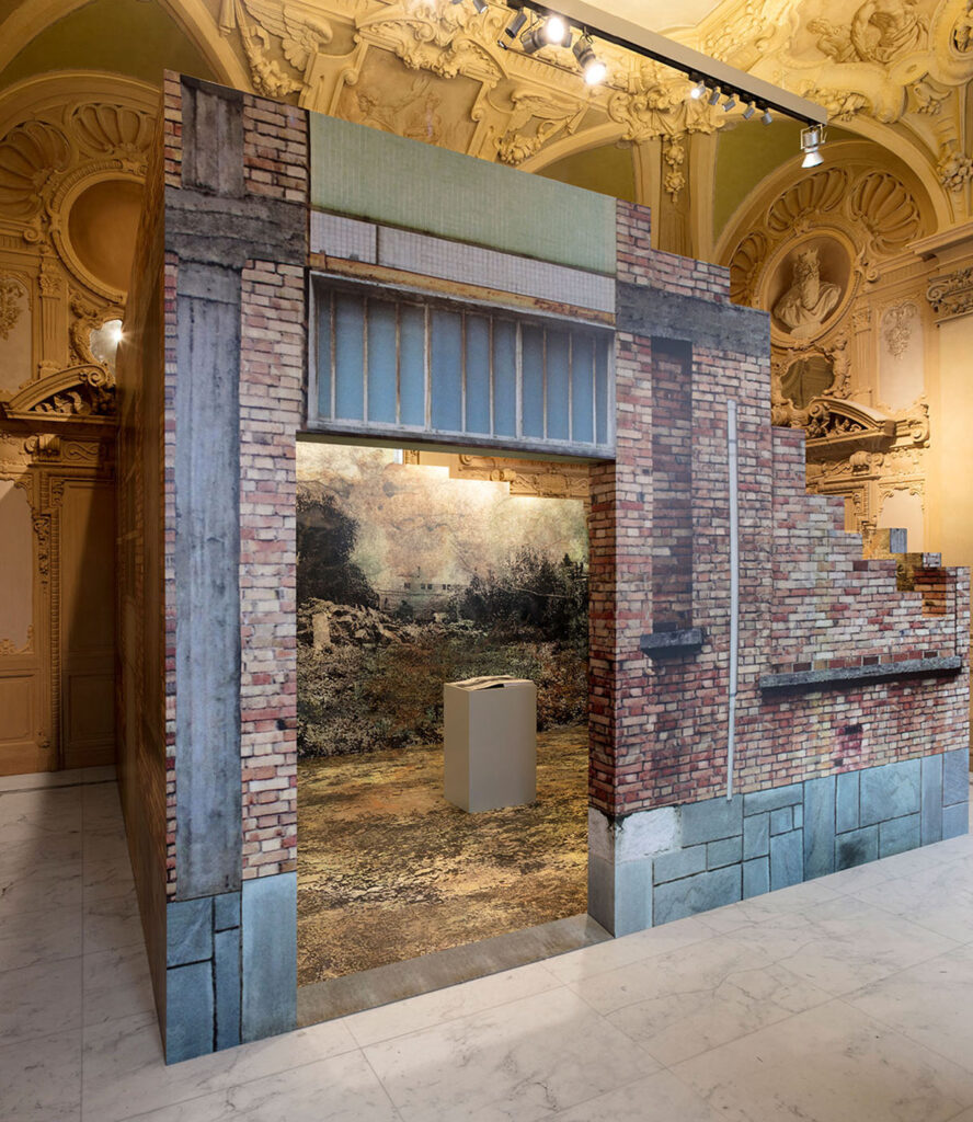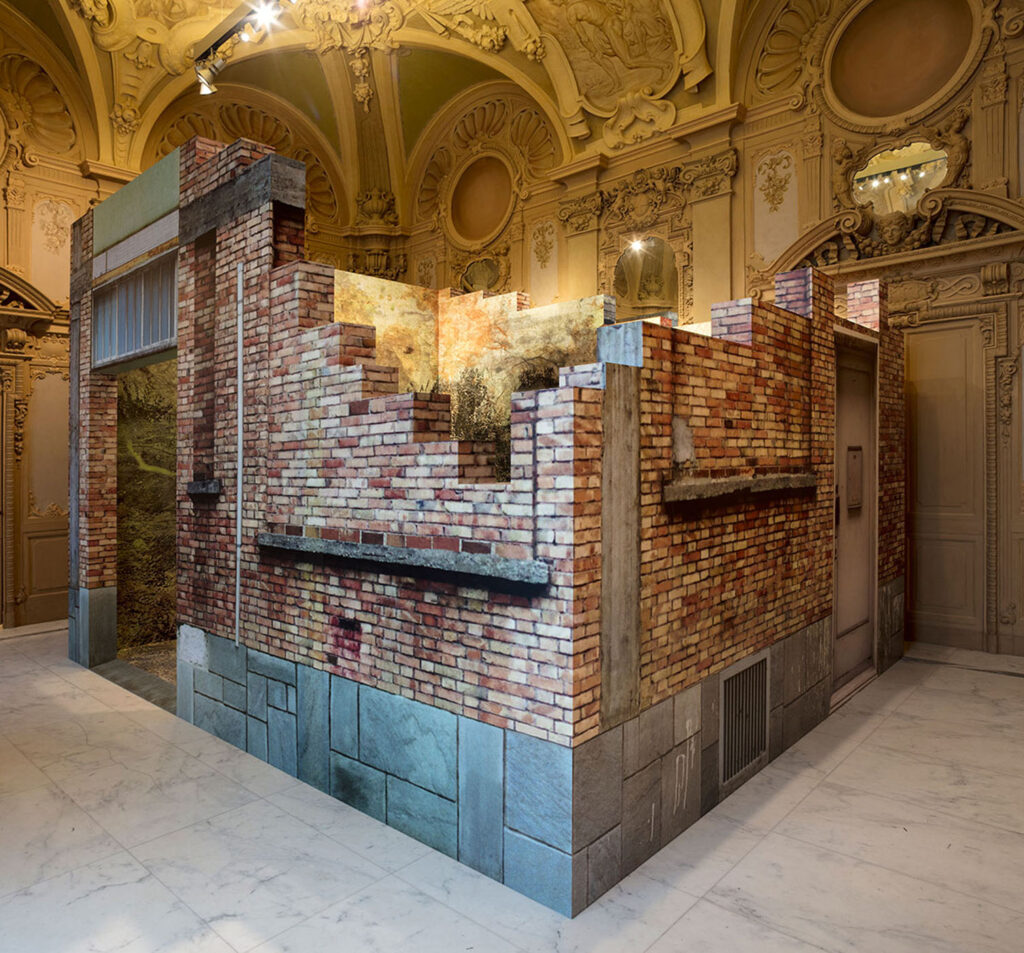 The Sala degli Stucchi, one of the exhibition rooms along the itinerary, is richly decorated and overlooks a part of the city where the stratifications from the Roman era to the 1970s are clearly visible. The room surrounds the installation which looks like a contemporary “ruin”. The outer walls are the remains of a modernist architecture inside of which the interior walls and floor are completely covered with the image of a peripheral landscape where nature has swallowed up remains of buildings and past life.